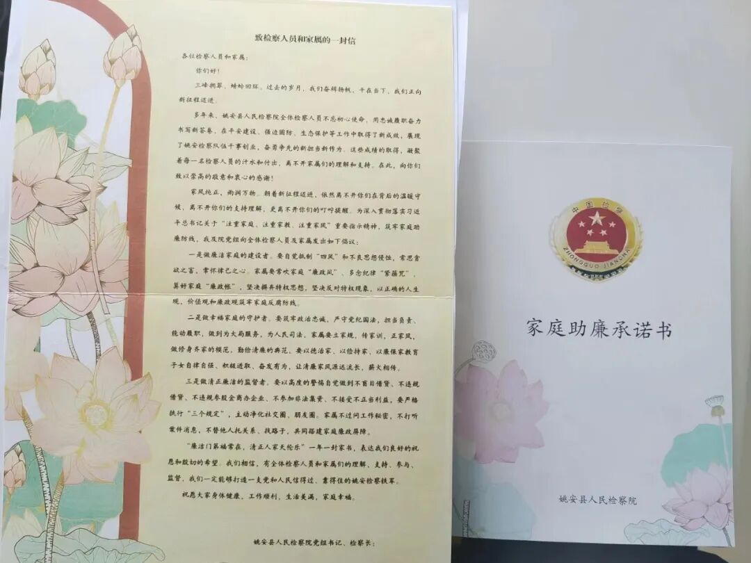 充分利用各种节日节点,开展家书谏廉活动,每年伊始,检察长都会给每一位干警家属寄出《致检察干警家属的谏廉书》,每年重阳节,院党组都会给每一位退休干部送去《致退休干部的节日廉谏》,每年春节前,都召开一次家属廉政座谈会,与家属签署《家庭助廉承诺书》,每一个传统节日,院党组都会向干警和家属发送助廉信息提醒,通过家书谏廉,不断强化家庭与单位在廉洁教育中的联系,引导干警家属在生活中常算廉洁账、常敲廉洁钟,鼓励检察干警与家属共同树立清廉家风,推进清廉机关与廉洁家庭深度融合。