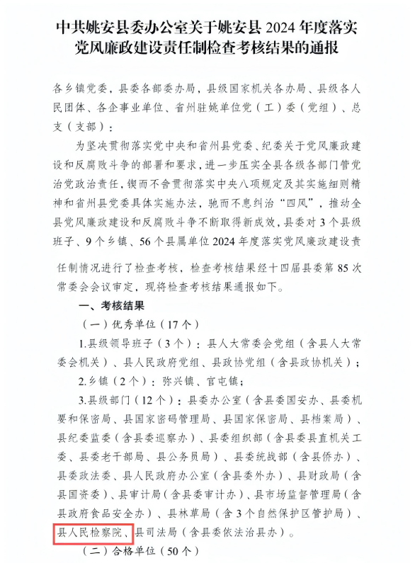 近日,姚安县落实党风廉政建设责任制检查考核结果公布,姚安县人民检察院获评优秀等次。