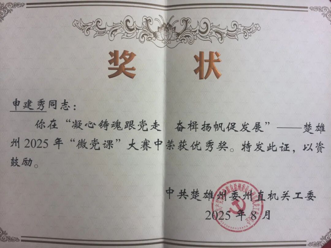 8月1日,“凝心铸魂跟党走 奋楫扬帆促发展”——楚雄州2025年“微党课”大赛圆满落幕,来自全州10县市的96名选手在复赛中展开激烈角逐,姚安县人民检察院干警申建秀同志在大赛中荣获优秀奖。