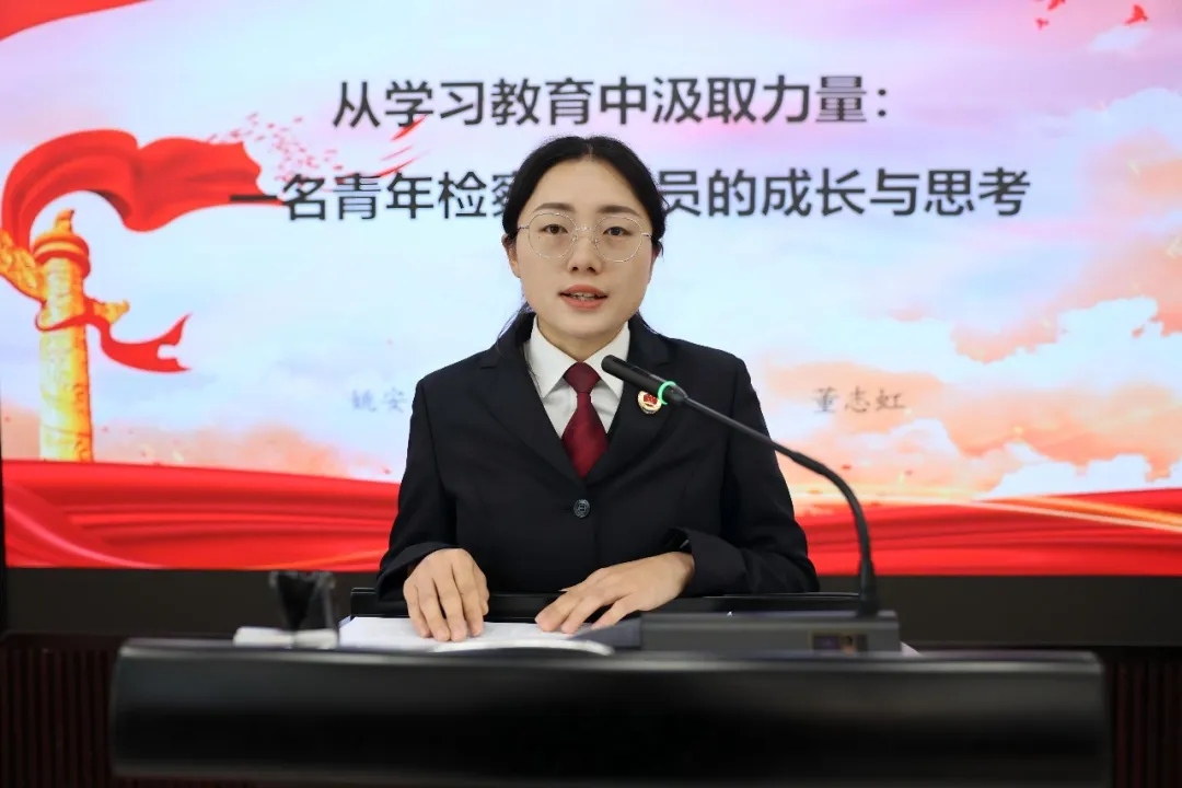 青年干警代表郭琳结合此次学习教育的学习感受,回顾了在检察院的蜕变历程,真诚表达将在学思践悟中擦亮政治底色,在互学互鉴中锤炼过硬本领,在实际工作中彰显奋勇争先的姚检青年风采!