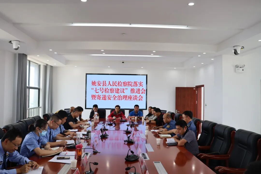 为贯彻落实最高人民检察院“七号检察建议”,提升寄递安全质效,强化寄递业安全监管,守护“快递包裹里的安全”,2023年7月21日上午,姚安县人民检察院组织召开落实“七号检察建议”暨寄递安全治理座谈会。县公安局、县交通运输局、县烟草专卖局派员参加了会议,会议还邀请了州邮政局、邮政ENS、申通快递、京邦物流等19家寄递企业代表参加座谈会。楚雄州人民检察院第二检察部主任张绍宏到会指导。