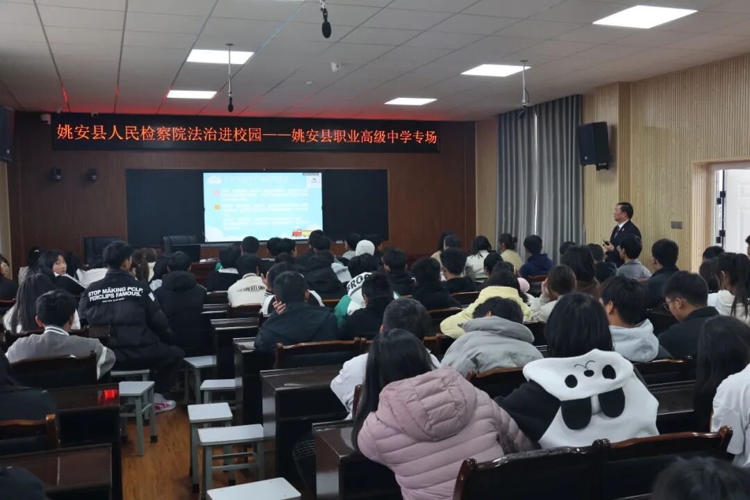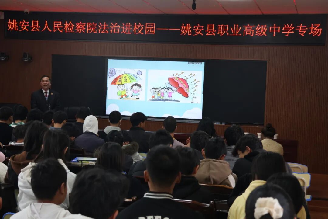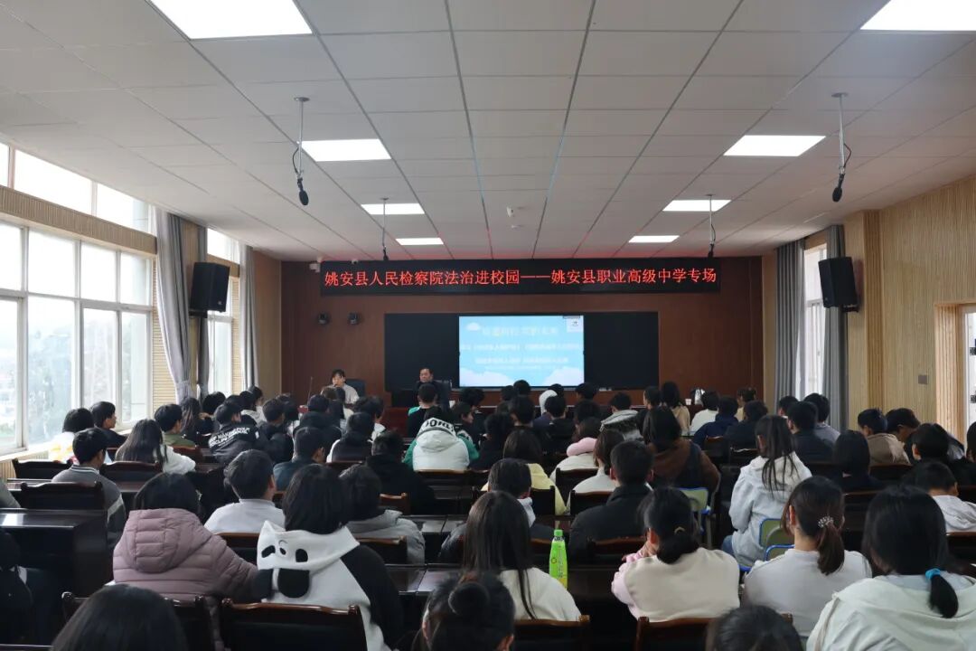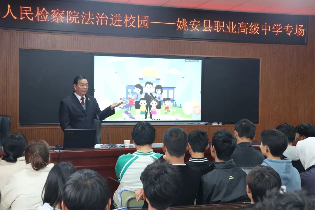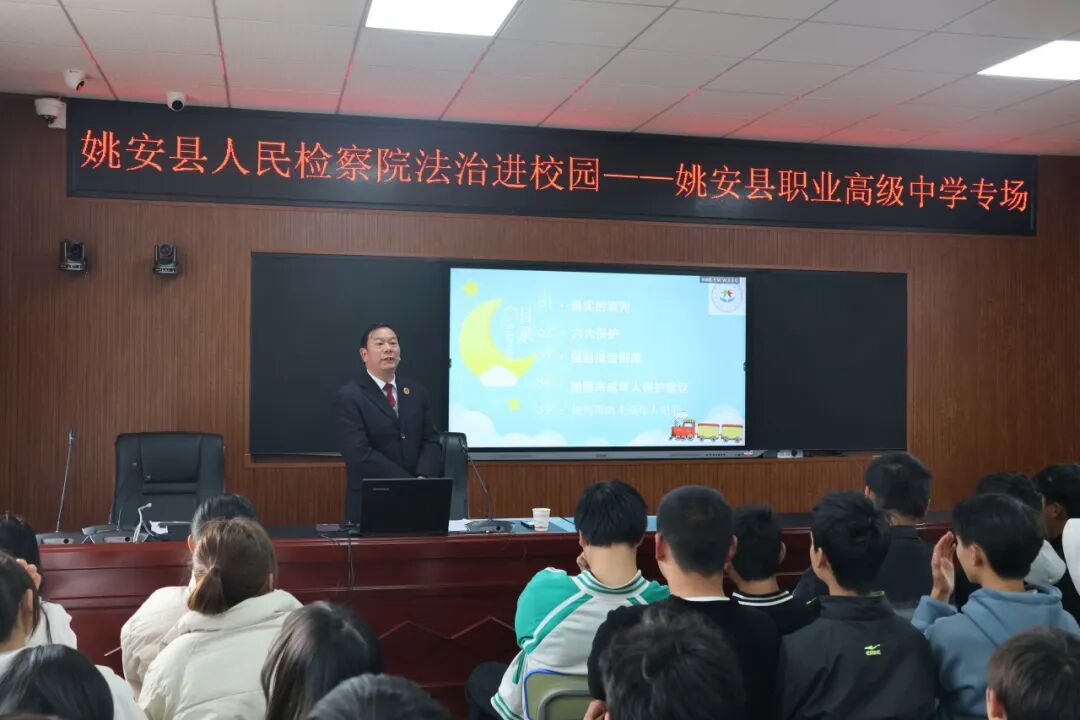 2023年12月14日下午,姚安县人民检察院四级高级检察官、县职业高级中学法治副校长任宝轩到县职业高级中学,为师生们开展了一场精彩的法治讲座,讲座以“学习《中华人民共和国未成年人保护法》《中华人民共和国预防未成年人犯罪法》、加强未成年人保护、预防未成年人犯罪”为题,从多个角度深入浅出地为同学们讲解法律知识。当天,姚安县职业高级中学共150余名师生参加并聆听了本次法治讲座。