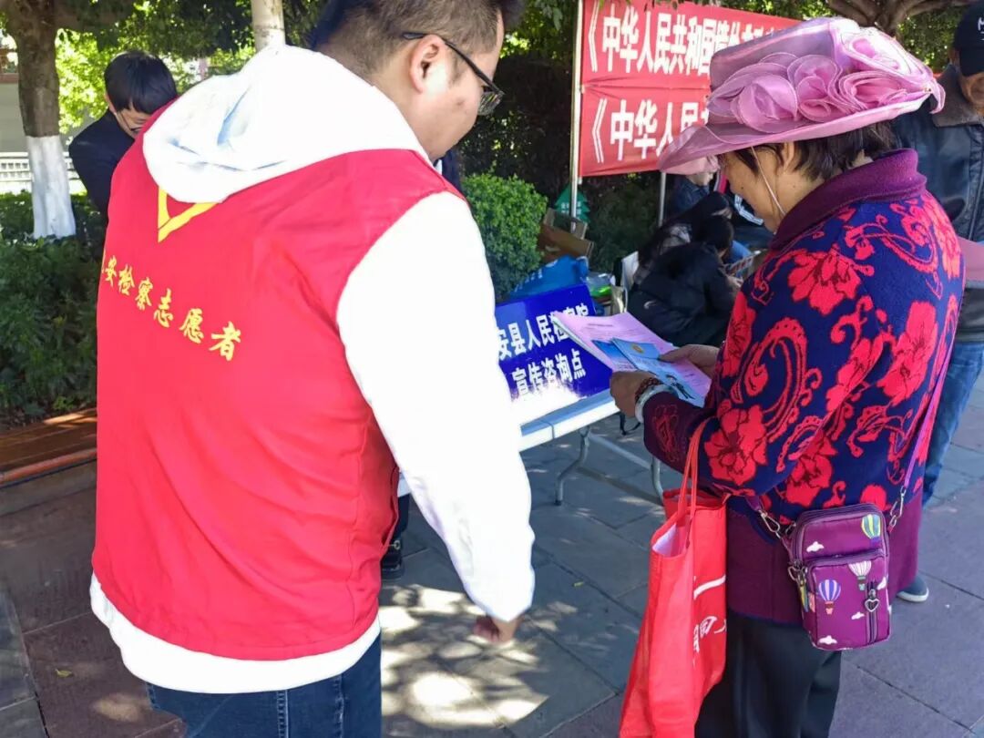 12月4日下午,县检察院组织干警到梅葛广场参加姚安县2024年国际志愿者日系列活动启动仪式。依托“12.4国家宪法日”宣传活动,干警纷纷变身为“普法摊主”,通过发放宣传资料、法律政策解读、现场咨询等方式,向群众进行普法宣传,引导群众尊崇宪法、学习宪法、遵守宪法、维护宪法、运用宪法,努力使尊法学法守法用法在全社会蔚然成风。