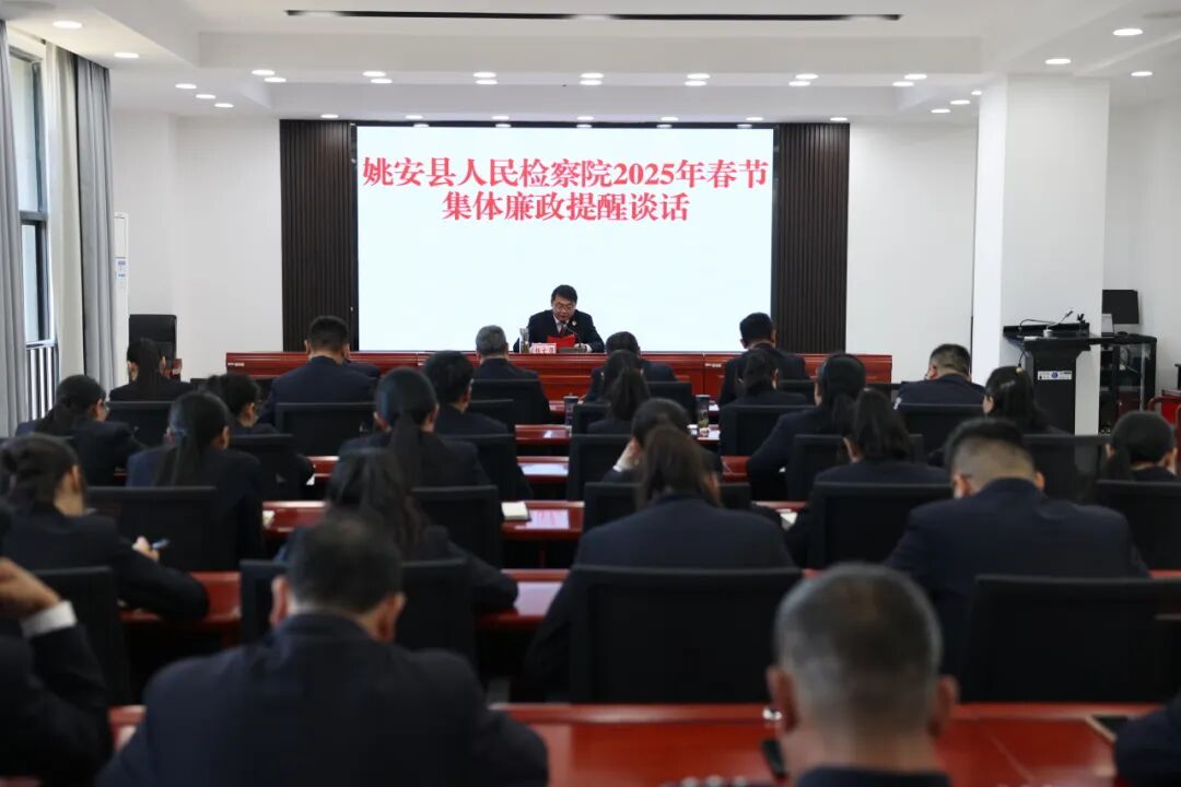 2025年1月24日,姚安县人民检察院开展春节前警示教育暨集体廉政提醒谈话。传达学习县纪委《关于做好2025年元旦春节期间正风肃纪工作的通知》,并通报了3起违反中央八项规定精神典型案例。院党组书记、检察长杨文强出席会议并与全院干警进行了廉政提醒谈话。