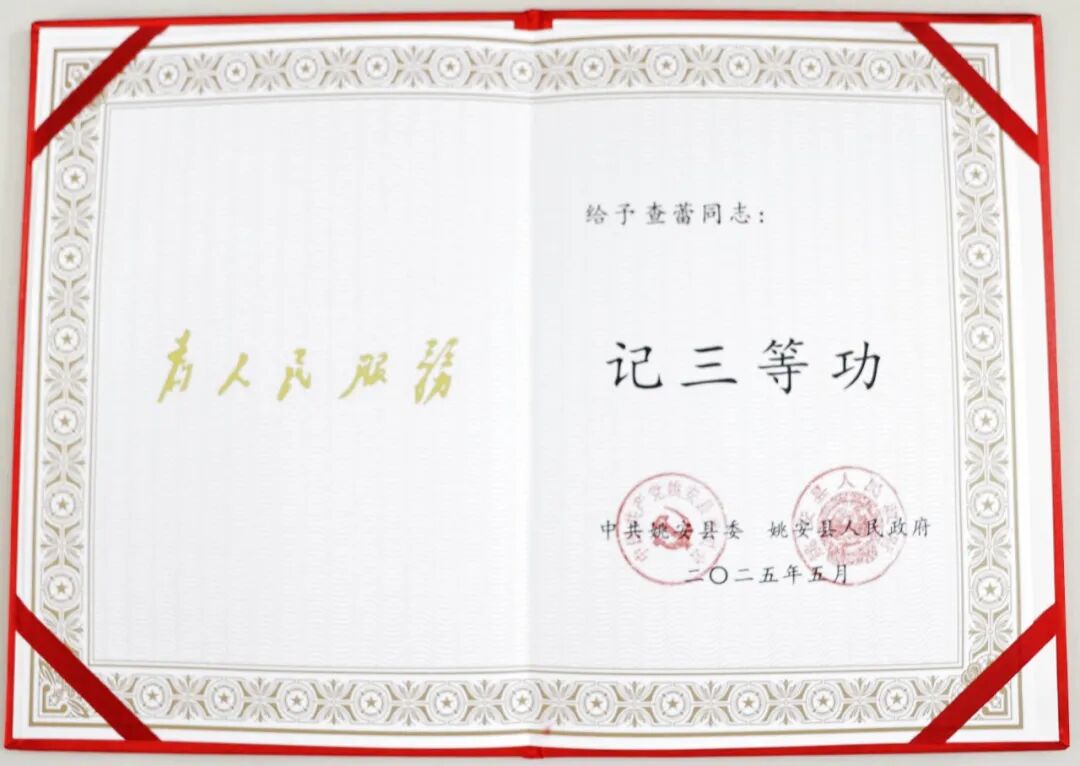 2025年5月,姚安县人民检察院干警查蕾被中共姚安县委、姚安县人民政府记三等功。
